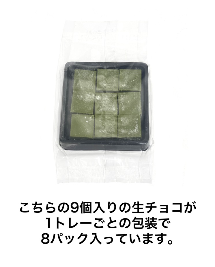 チョコレート(国内製造)(砂糖、ココアバター、乳糖、植物油脂、全粉乳、脱脂粉乳)、生クリーム、洋酒、抹茶、植物油脂、砂糖結合水飴、粉糖/乳化剤、(一部に乳成分・大豆を含む) |